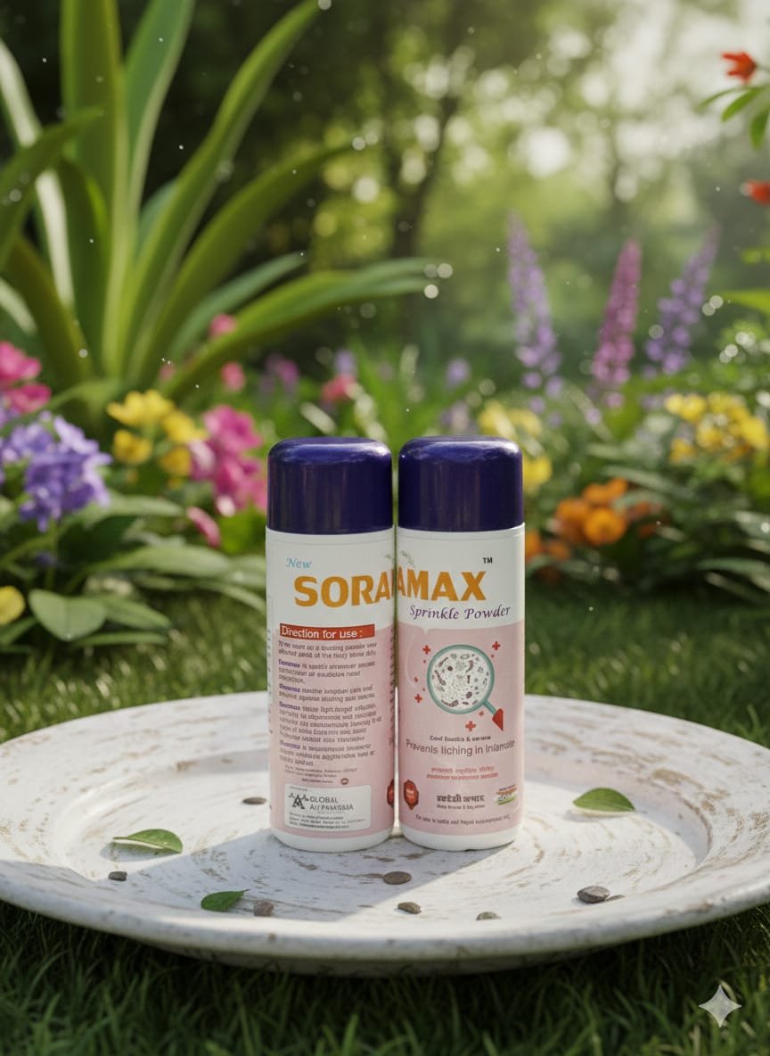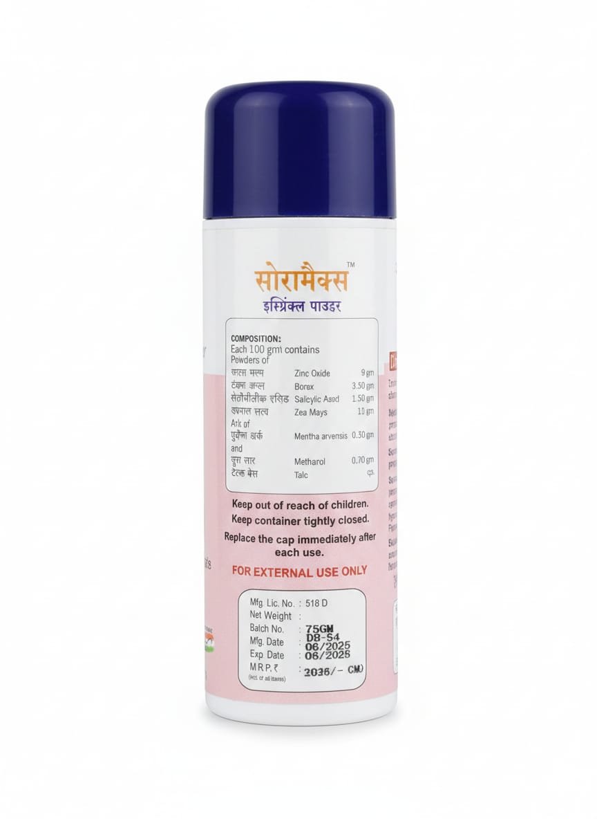 Soramax Sprinkle Powder is medically superior for patients requiring more than just antifungal action. It addresses the trinity of skin distress: Moisture (Zea Mays), Infection (Salicylic Acid/Borax), and Inflammation (Zinc Oxide).